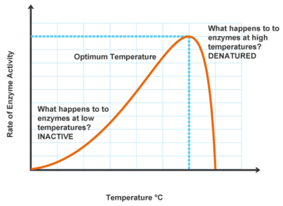 As the temperature increases so does the rate of enzyme activity. Most enzymes will become denatured at very high temperatures. If the temperature is too far below or too high above this range the enzyme stops working.
